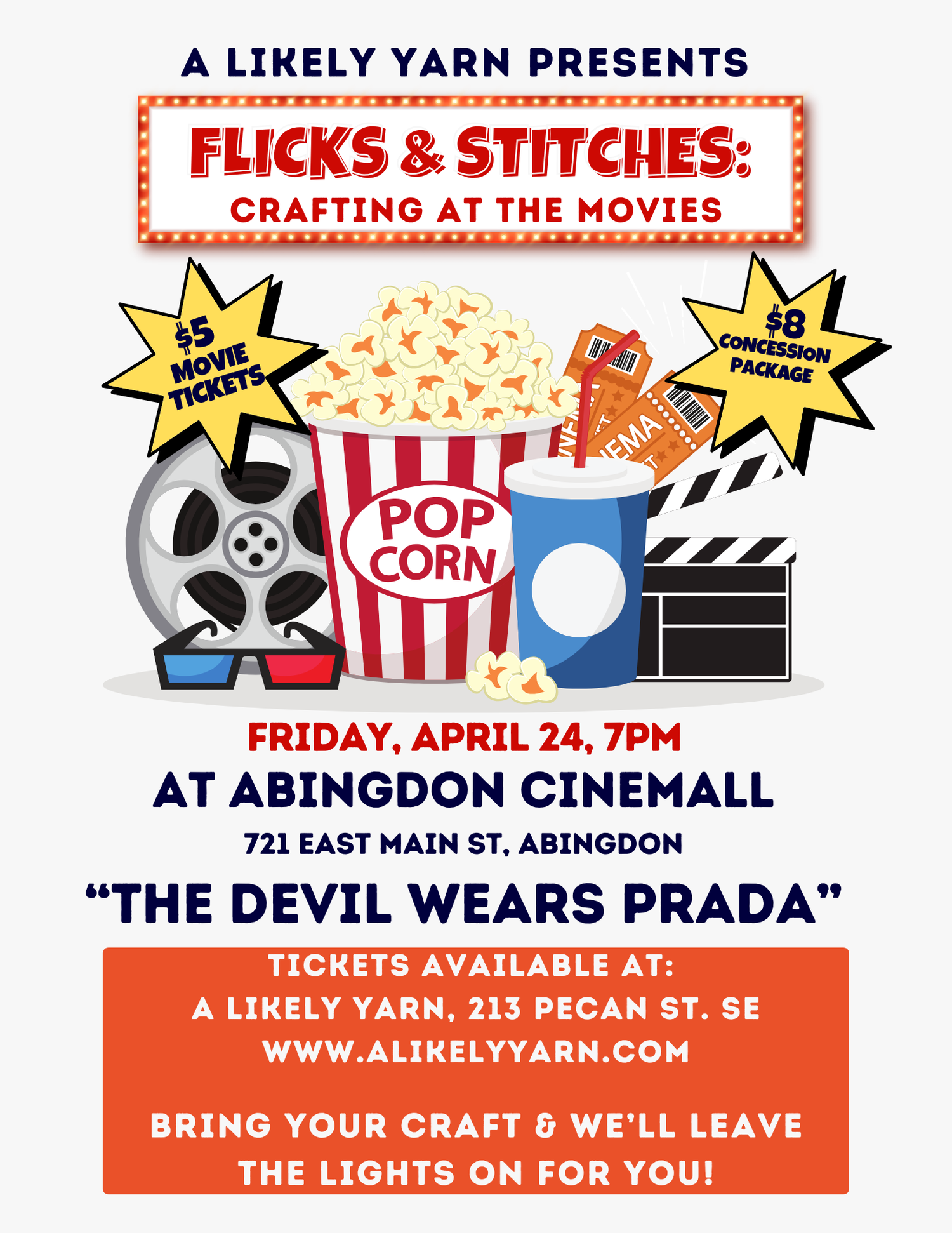 Fri, 4/24 - Launch Cesium Yarn & Camp Stitchwood Trunk Shows, NEW Flicks & Stitches Movie Night at Abingdon Cinemall showing "The Devil Wears Prada" 7pm